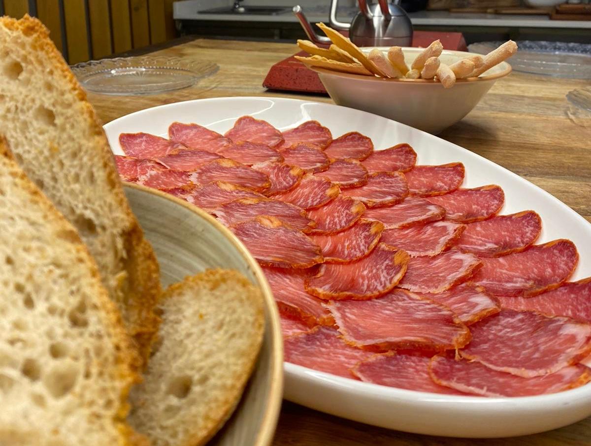 Lomito Presa Ibérico: selected piece of Iberian pork, marinated with salt, paprika and natural spices, and cured slowly. Result: deep aroma, balanced fat infiltration and an intense and round flavor. Perfect for boards, gourmet bites or a simple high-level sandwich.